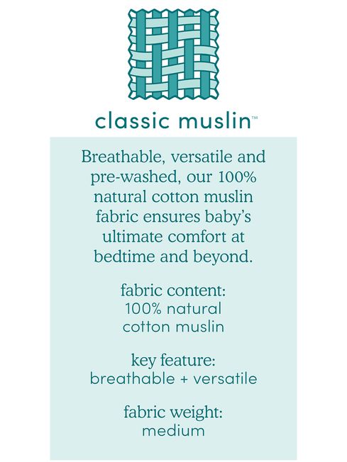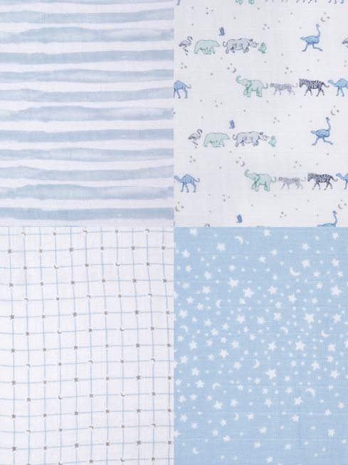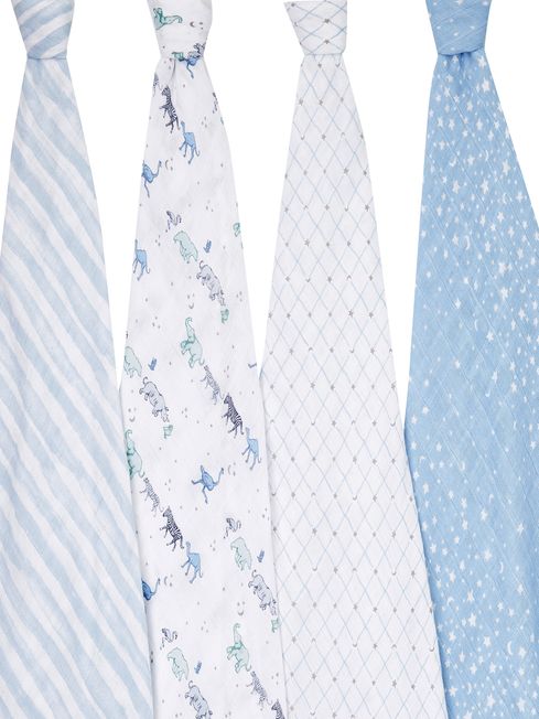 aden + anais organic cotton muslin blankets are consciously crafted with quality and sustainability in mind, meeting the strictest ecological, social, and processing standards. Highly breathable and supremely soft, these versatile blankets can be used in 5 additional ways –burp cloth, nursing cover, tummy time mat, changing mat, and receiving blanket. Signature hand-drawn prints are printed on premium quality organic cotton muslin that gets softer with every wash. 100% organic cotton 4 pre-washed 120cm x 120cm blankets Versatile, use as burp cloth, nursing cover + more Breathable to help reduce the risk of overheating Machine washable + softer with each wash Wash before first use. Machine wash cold with like colours. Use only non-chlorine bleach when needed. Tumble dry low. Warm iron if needed. Do not dry clean. Free of azo chemical compounds Recyclable packaging in compliance with the Green Dot initiative