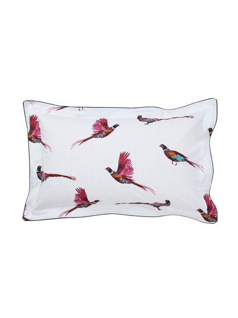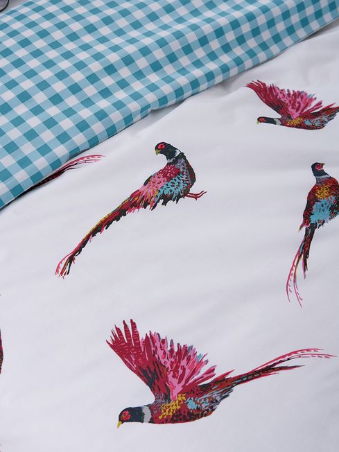 Go to sleep surrounded by the countryside's most colourful resident - the pheasant - with this beautiful bedding set. Intricately hand-drawn in flight and resting pheasants adorn a neutral créme background which will add character to your bedroom. The reverse is a picnic blanket gingham in a muted green hue. This set comes with two matching Oxford pillowcases (single beds come with one) and can be complemented by additional standard pillowcases sold separately. 100% Cotton Percale 180 TC.