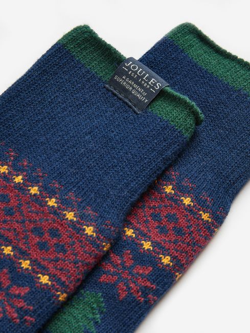 Put a touch of festive fun into every step with these wintry Boot Socks. Designed to be worn under boots to keep your feet warm and cosy, they're adorned with a fir tree Fairisle pattern as well as a contrasting toe and heel. We've added an elasticated, ribbed cuff for extra comfort and an elastane panel at the arch for a snug fit that won't bunch up or roll down. Knitted boot socks Single pair Festive design Contrasting heel and toe Joules branded tab to the cuff