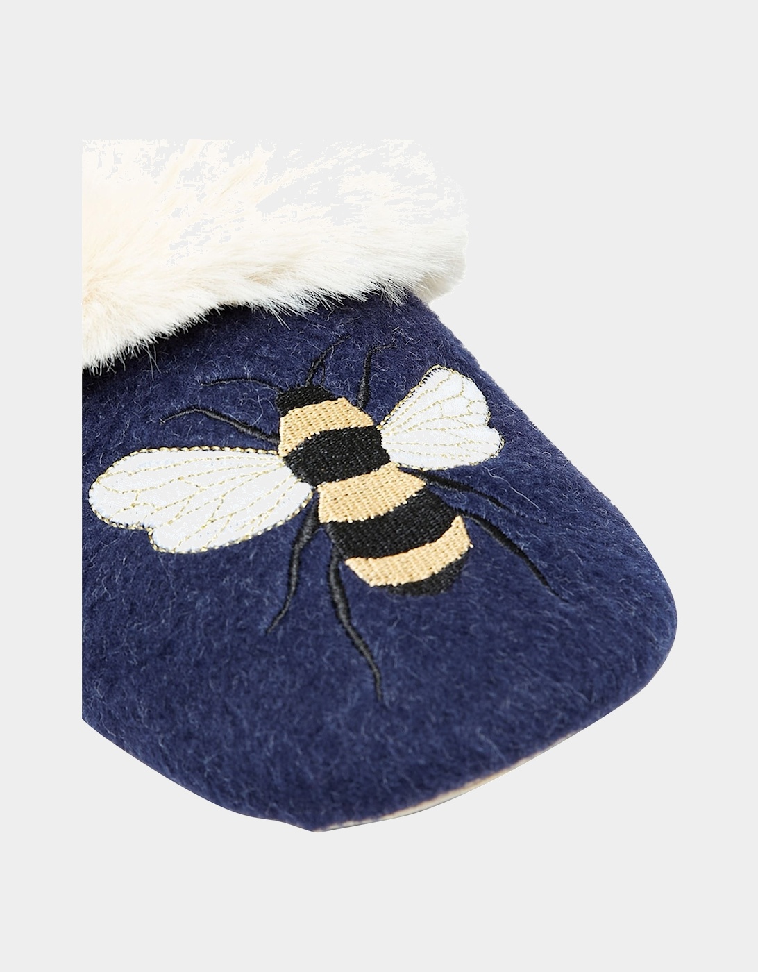These Joules Slippet Luxe Bee Slippers have a textile felt upper and are navy blue in colour with an embroidered bee on the toes. They have a ultra soft faux fur lining with a faux fur collar. It has an indoor textile sole with grippy bubble printing on the toe and heels.