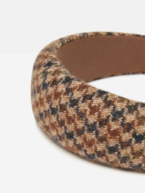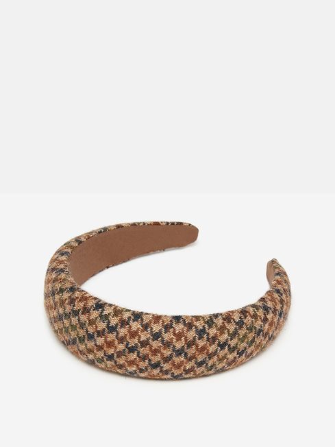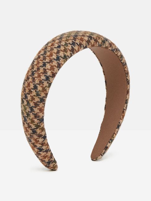 The simple addition of a headband can elevate an outfit in an instant. The Tessie combines the classic elegance of a headband with a traditional twist of tweed. The tweed fabric is wrapped over a stiffener which adds subtle volume and height for a statement. It's completed with Joules gold branding on the inside band. Wool blend Tweed fabric Covered stiffener to add volume Joules branding on inside band