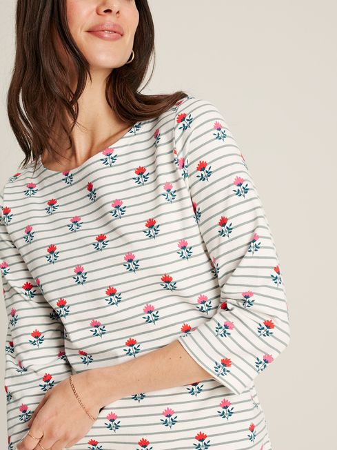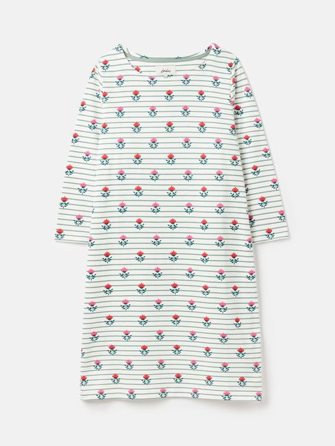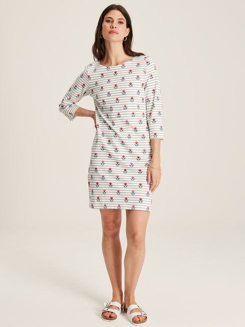 Comfortable yet stylish, this jersey dress is a real summer essential. It's crafted from soft jersey and has a midi length perfect for pairing with your favourite sandals or pumps. For a summery touch, it has short sleeves and a hand-drawn floral print contrasted against a background of stripes. Love it beyond this season by layering it under a sweatshirt when the temperatures start to drop. Jersey Dress Straight fit through the body Midi length Short sleeves Crew neck Round neck Hand-drawn print Joules branded detail to the hem and left sleeve (as worn)