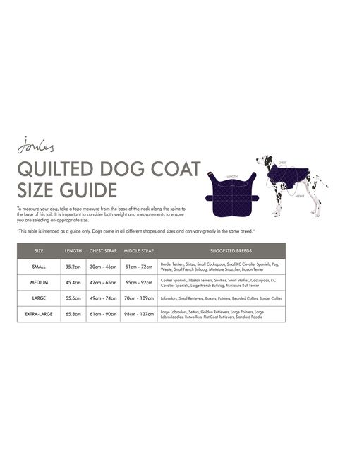Diamond quilted padded coat with fleece lining for ultimate warmth in cold conditions. Quick and easy to put on and take off with Velcro fastenings and Joules embellishments. Complete with adjustable straps and back opening for securing lead or harness. Small - 26x1x34cm Medium - 36x1x45cm