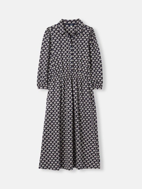 This long-sleeve midaxi dress is so easy to wear, it won't spend much time on its hanger. Cut in a shirt dress style with a collar and button-down front, it has slight gathers to the top of the sleeves for added shape, as well as a flattering shirred waistline. As a handy extra detail, we've added two side pockets with colour pop stitching. The hand-drawn print that adorns it captures the colour palette of the season and will take you from day to night effortlessly. Jersey cotton Midaxi length Long sleeves with gathers at the shoulder Collar Button-down placket to the front Shirred waistline Side pockets with colour pop stitching Hand-drawn print Length: 125cm (based on a UK size 12)