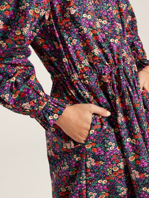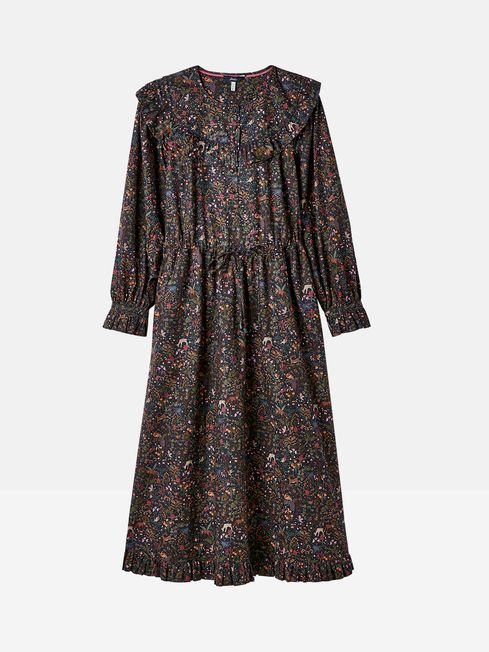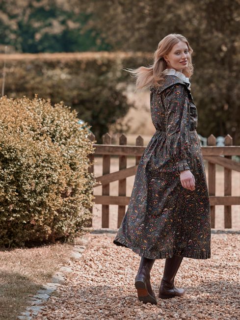 Has Heidi caught your eye? We're not surprised. This darling twist on the traditional is going to be turning heads everywhere you go. The button placket, statement frilled yoke, hem and gathered cuffs are reminiscent of classic country style. A midaxi length and gathered waistline with adjustable fabric ties creates a flowing yet flattering silhouette that pairs beautifully with a pair of leather boots. As for the print, it's been hand-drawn (of course!) and uses a colour palette perfect for the season. From a countryside jaunt to a party under the stars, this dress will quickly become your favourite frock. Cotton Midaxi length Frilled yoke with piping Frilled hem Button placket with fabric covered buttons Long raglan sleeves with frilled cuffs Keyhole button fastening to the cuffs Gathered waist with adjustable ties Hand-drawn print Length: 130cm (based on a UK size 12)