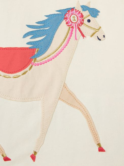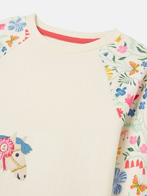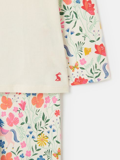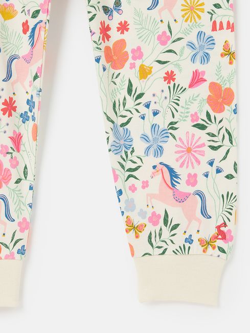 With a pretty pyjama set like this one waiting for them, they'll be galloping up the stairs when bedtime comes around. It's made from soft cotton jersey that feels as good as it looks. The top has a slim fit, long sleeves, a crew neck and features an applique show pony to the front bedazzled with glittery details. The sleeves feature a hand-drawn floral and horse print, which matches back to the bottoms. An elasticated waist, ribbed cuffs and a slim fit makes the bottoms oh-so-comfy. For an extra special touch, we've written and printed a fun poem to the inside back neck which they'll love hearing before they hit the hay. Jersey cotton Slim fit Crew neck Applique pony to the front with glitter detail Elasticated waist bottoms Ribbed cuffs Hand-drawn print Poem printed to the back neck Joules branded hare to the hem of the top and cuffs of the bottoms Matching dressing gown available