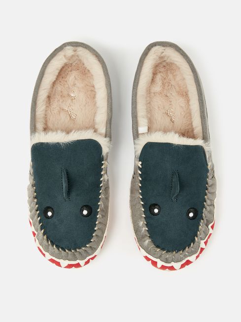 These moccasin slippers will add a snappy touch to your little one's at-home attire. The microsuede uppers feature a shark design complete with a padded 3D fin, an embroidered face and gills. Lining the inside is a super soft faux fur that they can wiggle their toes into. The rubber outsole makes them more durable and provides extra grip. They're finished with metallic Joules branding to the insole. Now sit back and watch their faces fill with joy when they see these! Microsuede Moccasin-style Faux fur lining Padded 3D fin Embroidered eyes, nose and gills Rubber outsole Branded metallic embroidery to the insole