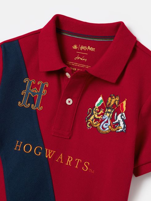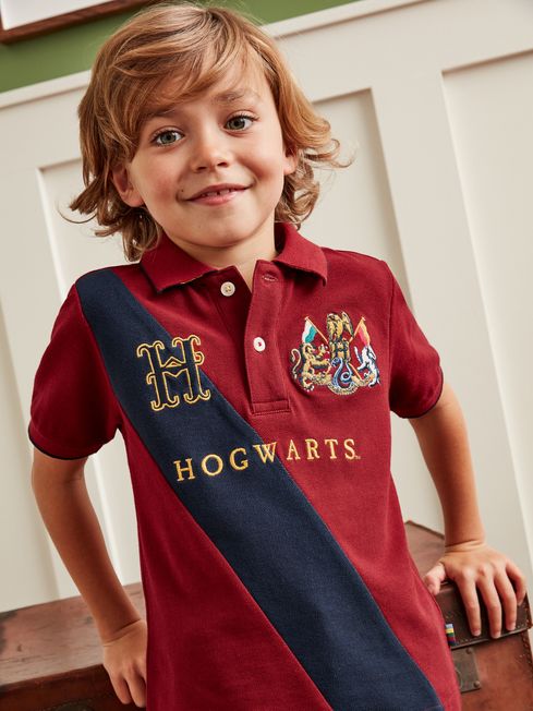 A classic sporty design mixed with details inspired by Harry Potter™ come together to create this must-have polo shirt for little ones. Gryffindors™ will be delighted to find their house colour represented with the addition of a contrasting navy sash to the front. Odes to Hogwarts™ can be seen throughout the style including an embroidered school crest and 'H', to the chest and hidden Hogwarts wording in a jacquard knit under the collar. Pique cotton fabric, a button placket and knit cuffs gives it its traditional polo characteristics. Part of our official Harry Potter™ collection Cotton pique fabric Short sleeves with knit cuffs Button placket Collar with Hogwarts™ jacquard knit detailing under the collar Contrasting sash panel to the front Hogwarts School Crest™ and 'H' embroidered to the chest WIZARDING WORLD and all related trademarks, characters, names and indicia © & ™ Warner Bros. Entertainment Inc. Publishing Rights © JKR. (s23)