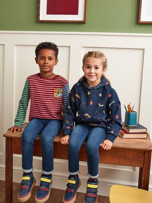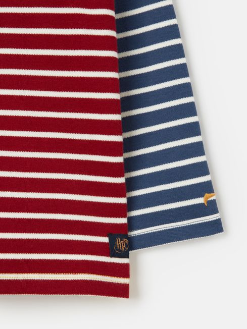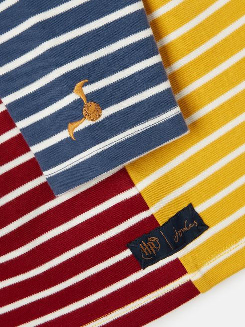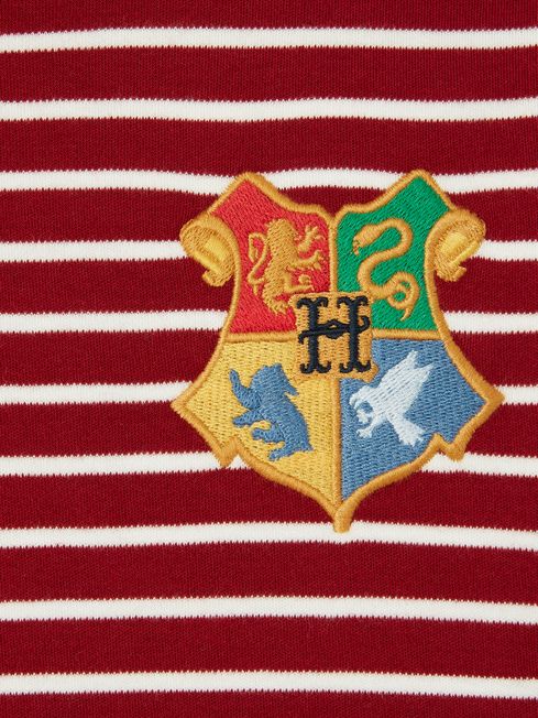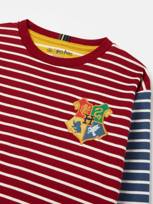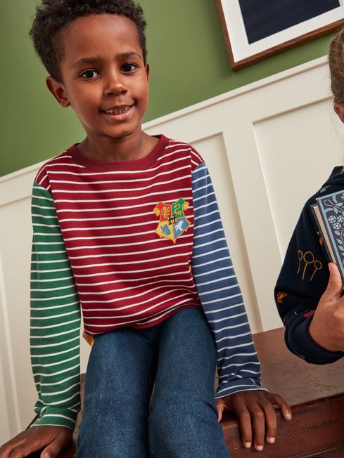 All Harry Potter™ fans can be equally delighted with this top, as every Hogwarts™ house colour is featured and the school crest embroidered to the chest. It's crafted from hardwearing jersey, has a classic fit, crew neck and dropped shoulders making it a great style for layering up and heading out on a quest for adventure. Just as the Golden Snitch™ hides in the skies, it's tucked away on the cuff as a glittery embroidered detail, which will be a wondrous discovery for your little one. Part of our official Harry Potter™ collection Jersey Classic fit Long sleeves with dropped shoulders Crew neck Hogwarts™ house colours in hotchpotch stripes Embroidered Hogwarts School Crest™ to the chest Metallic Golden Snitch™ embroidered to the left sleeve cuff (as worn) Woven brand label to the hem WIZARDING WORLD and all related trademarks, characters, names and indicia © & ™ Warner Bros. Entertainment Inc. Publishing Rights © JKR. (s23)