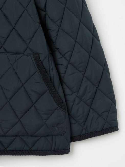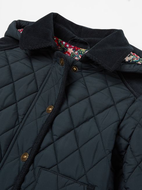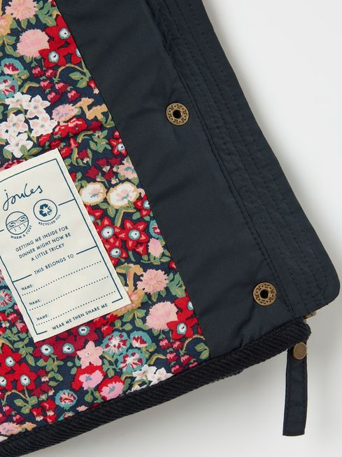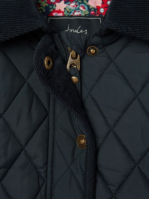 From the playground to the schoolyard and everywhere in between, our Marsdale quilted jacket will have pride of place on their coat peg. It has zip and popper fastening and the diamond quilted fabric is showerproof, making it perfect for quick dashes to the car in light bursts of rain. The back is elasticated with fixed waist tabs, and a detachable hood means they can choose their level of cosiness. As an extra stylish detail that will make them feel oh-so-grown-up, our designers have added a ditsy floral lining and cord trims throughout. Diamond quilted Showerproof Cord detailing Ditsy floral lining Detachable zip-off hood Two patch pockets Elasticated back with fixed popper tabs Joules hare embroidery to pocket Matching gilet available