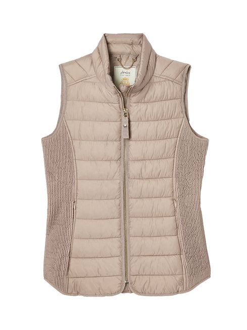 A gilet is one of those wardrobe wonders that you'll call on time and time again. So if you're looking for your first one, or to update your current, our new Whitlow is just the ticket. Feel-good features include chevron quilting, elasticated side panels for a flattering shape and beautiful top stitch detailing throughout. Its buttery-soft outer is showerproof making it a wonder in light bursts of rain. There's a full zip fastening with a zip guard, two side pockets with concealed zips for a sleek look and a curved hem. We've made it in an easy-to-style colour and finished it with a Joules hare to the hem too. Showerproof Padded Chevron quilting Elasticated side panels for a flattering fit Zip fastening Hand-drawn printed lining Concealed zip pockets Buttery-soft pearlised finish Joules embroidered hare to the hem