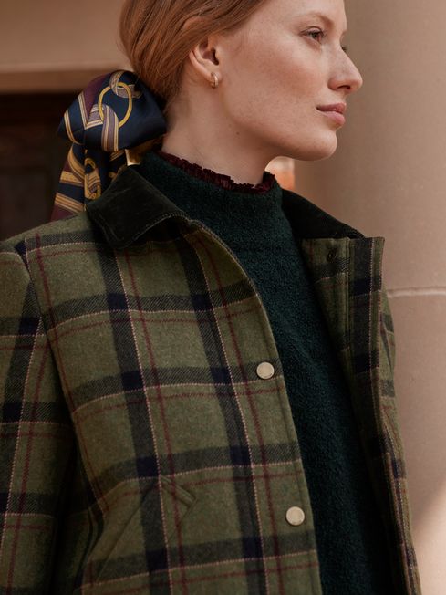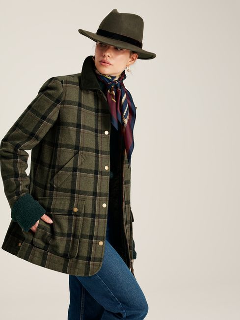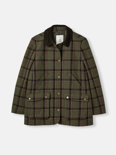 Designed for spending hours roaming the fields of Great Britain, the Berkley is an outdoor style you can count on. The tweed is a nod to our countryside heritage and carries a traditional colour palette of deep greens and browns. The vertical quilted lining filled with wadding will keep you warm when the colder climes hit and its overall relaxed fit gives you room to layer. Attention to detail is never missed and can be seen through the cord collar and trims, back and cuff vents and the hand-drawn printed lining. The practicalities matter, which is why we've added classic bellow pockets, as well as slip-in pockets below the chest and an additional one on the inside. To elevate it, the poppers throughout have an antique brass effect and the coat comes with a brass hare pin (packaged separately) which when pinned to the collar will finish the look off perfectly. Wool blend Relaxed fit Vertical quilted lining in a hand-drawn print Cord collar and trims Antique brass effect poppers Back and cuff vents with popper fastenings Bellow pockets with popper fastenings Additional two chest slip-in pockets and an internal pocket Metal hare pin (packaged separately) Length: 76.5cm (based on UK size 12)