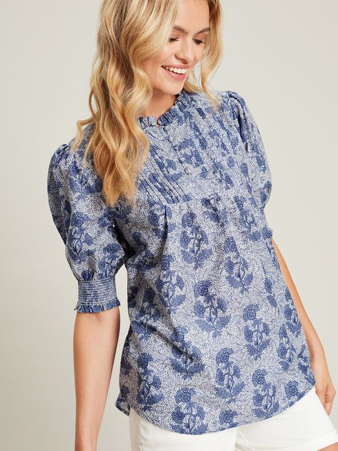 Make room for this beautiful blouse in your wardrobe. The short sleeves and hand-drawn print will pair perfectly with the sunshine, while the frilled neckline adds a delicate touch. It has pleated detailing to the front, elasticated cuffs, a button placket and flattering curved neckline. Pair with anything from skirts, shorts, jeans and more.