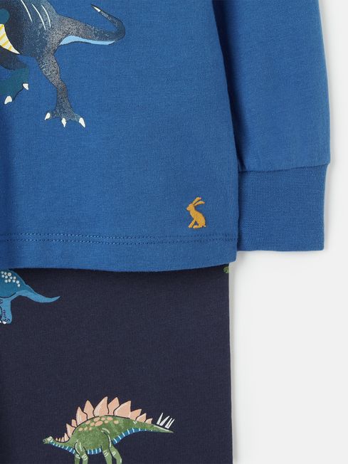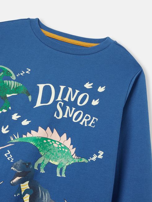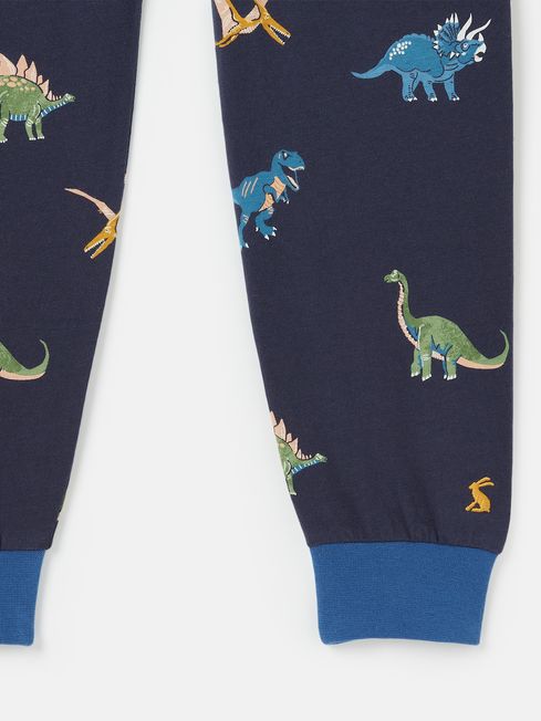 With a roarsome pyjama set like this one waiting for them, they'll be racing up the stairs when bedtime comes around. It's made from a soft cotton jersey that feels as good as it looks. The top has a slim fit, long sleeves, and a crew neck and features dinosaurs (or, should we say, dino-snores) to the front. An elasticated waist, ribbed cuffs and a slim fit make the bottoms oh-so-comfy while the hand-drawn dino print adds a bright pop of colour. For an extra special touch, the set glows in the dark and features a fun poem on the inside back neck. Jersey cotton Slim fit set Long sleeves Crew neck Printed dinosaurs to the front Elasticated waist bottoms Ribbed cuffs Hand-drawn print Poem printed to the inside back neck Glow in the dark Matching dressing gown available
