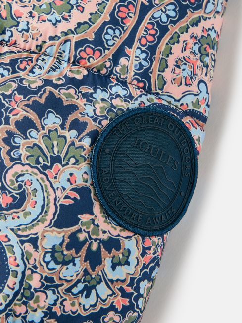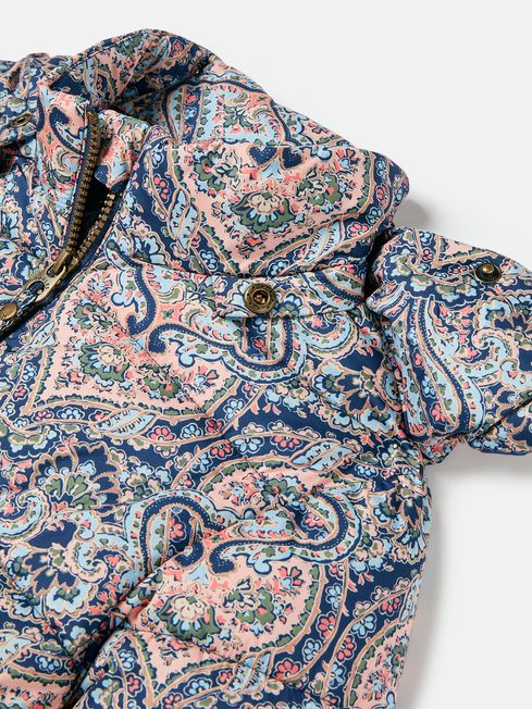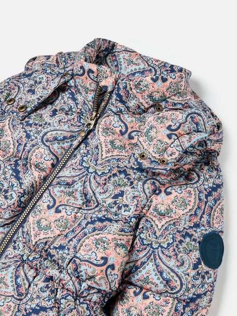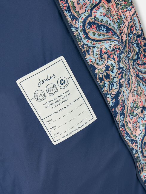 When the frost comes creeping in and it's time to start digging out the layers. And our Ainsley coat is just what you need to keep your little ones snuggly and warm. It's thickly padded for maximum comfort, with a removable hood and chin guard with popper fastening for when they need a little extra protection from the elements. The fabric is showerproof, making it ideal for light bursts of rain. It has an elasticated waist for the perfect fit, and dropped shoulders make it great for layering over a jumper or sweatshirt. The pockets are fleece lined too for keeping little hands cosy. The pretty paisley print will make them feel oh-so grown up, and we've added a name label to the inside so they're all ready for the school cloakroom. Padded Showerproof Elasticated waist Zip fastening Removable hood Chin guard with popper fastening Two fleece lined side pockets Rubber branded badge to arm Joules hare embroidery to hem