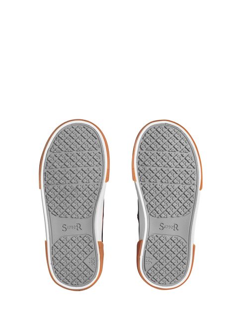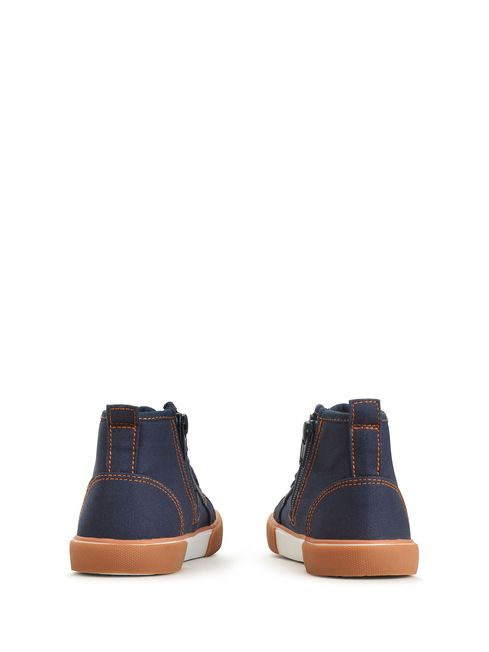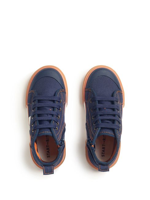 F = Standard Fit. Start-Rite's contemporary hi-top for the cool kids in the playground. A grownup lace-up design with a handy side zip, these canvas kicks can be slipped on and off fast. Great for both indoors and outdoors, there is added toe protection and an engineered tread for grip on most surfaces. They are also washable at 30 degrees so keeping them clean and fresh is easy. In breathable navy canvas with white and orange accents. Don't forget to add a Start-Rite measuring gauge to your basket – fit at home the Rite way using the video to help you.