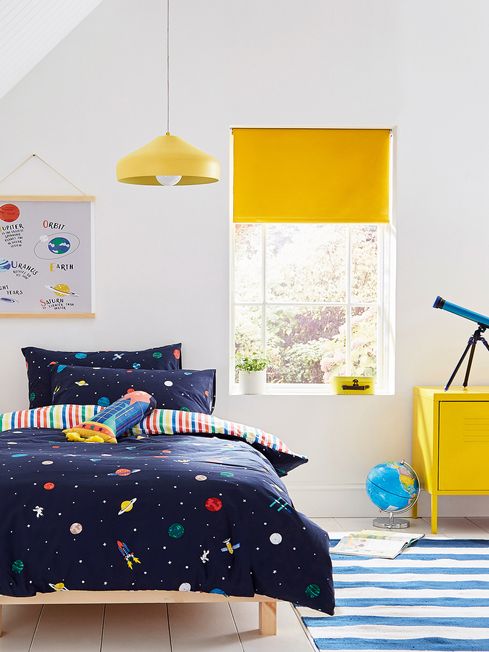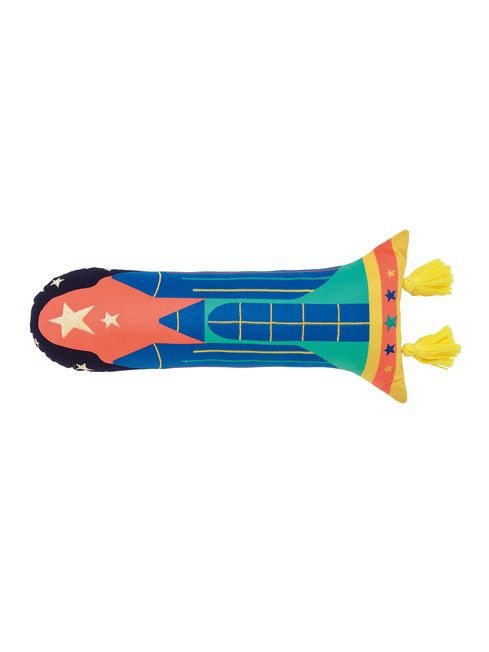 This is a cushion made for space-obsessed little ones. With the shape of a rocket, a bright colour palette and two tassels at the bottom, it is perfect for adding fun to their bedroom. When bedtime comes around and the lights are switched off, they'll watch in wonder as the cushion's embroidery glows in the dark! Match it back to the Up in Space bedding to create the best set in the whole of the universe.
