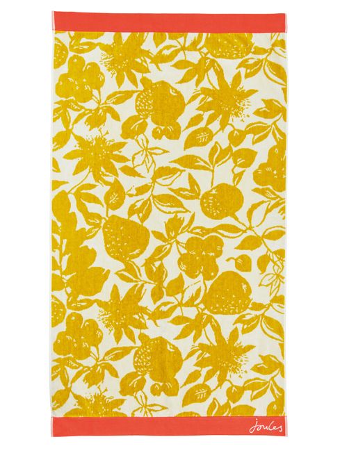Add some zestful energy into your bathroom with this towel. It's adorned in a hand-drawn fruit and floral print in a classic antique gold colour palette. The hems are a vibrant coral for a beautiful contrast . For supreme softness against your skin, the towel has a velour construction and has been made with combed cotton yarns. Choose from a hand towel, bath towel, bath sheet or bath mat - or opt for all four to complete the full collection. 100% BCI Cotton 600 GSM