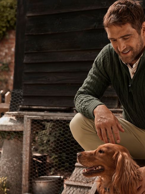 Cut from cotton and featuring a classic, heavyweight cable knit, this jumper is the versatile layer your wardrobe might be missing. Its quarter zip fastening and funnel neck opens up the possibility of building layers beneath it. It's finished with a ribbed hem, neck and cuffs, a faux leather zip pull and a Joules embroidered hare to the chest. Cotton Classic fit Cable knit stitch Quarter zip fastening with faux leather pull Ribbed funnel neck Ribbed hem and cuffs Joules embroidered hare to the chest