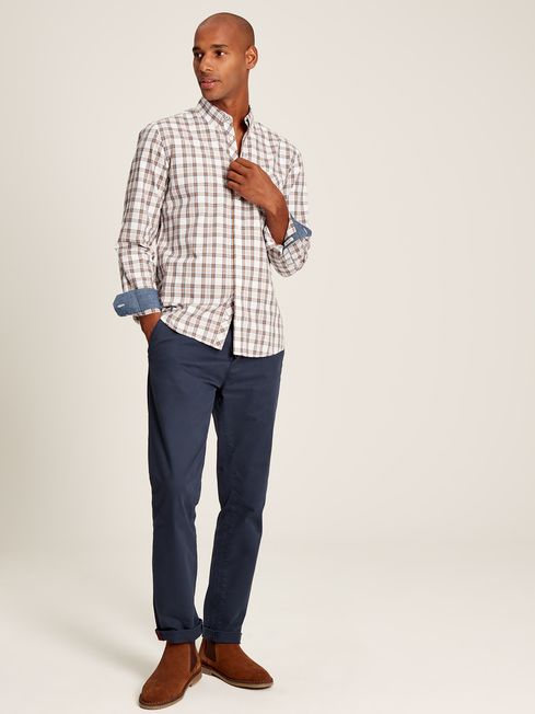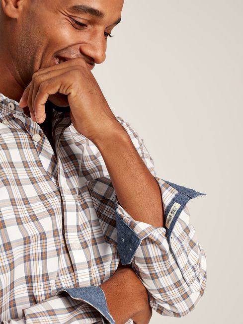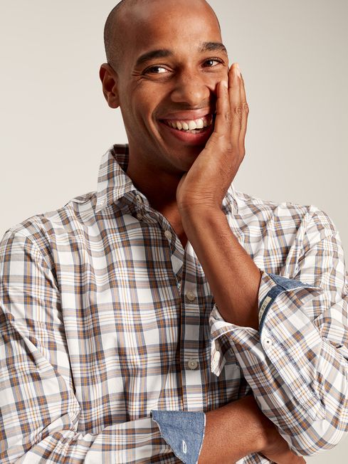 A checked shirt is one of those can't-go-wrong classics that every gent's wardrobe requires. The Goodridge is cut from a crisp cotton poplin and is adorned in a check that sits back with the autumn and winter seasons. It has an unfussy classic fit, a button-down fastening with button-down collar and cuffs and a patch pocket to the chest. For a distinctive finish, it has chambray trims and hidden embroidery to the cuff. Cotton poplin Classic fit Button down fastening Button down collar Single patch pocket to the chest Button down cuffs Chambray trims Hidden embroidery to the cuff Joules embroidered hare to the hem
