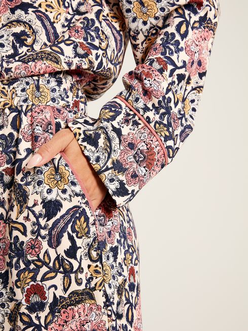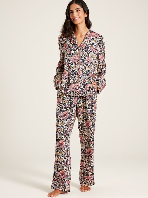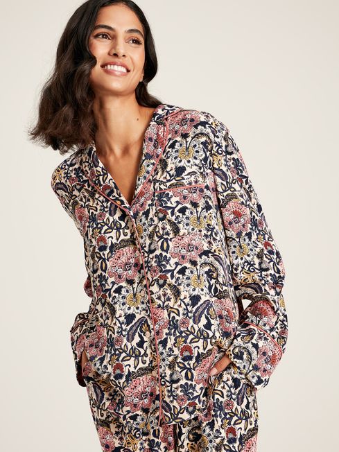 Drift off to dreamland with our ever-so-special Alma pyjama set. The set is crafted from lightweight and breathable viscose and comes with a long-sleeved button-up shirt, complete with a patch pocket and contrasting piped trims. The matching bottoms have a straight fit through the leg, an elasticated waist, luxurious velvet-topped drawcords and slanted side pockets. With a collection of heritage-inspired hand-drawn prints available, you'll be truly spoilt for choice. Viscose Long sleeves Button-down fastening Patch pocket to the chest Piped trims Velvet topped drawcords Elasticated waist Slanted side pockets Heritage print