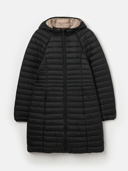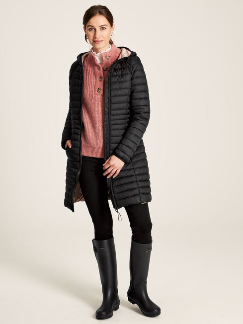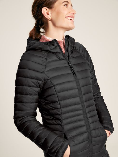 For the unpredictable British weather, you need a jacket that's predictably reliable. Our longer-style Bramley puffer jacket is perfect for keeping in the car when journeying to your next outdoor adventure, as it packs away into its own pocket for an instant layer of warmth whenever you need it. Unlike other bulkier padded jackets, this one has been designed to fit and flatter, with curved seams and thinner baffles to the waist. The fabric has a buttery soft hand-feel and is showerproof, making it ideal for light bursts of rain. You'll find a contrast lining with a pearlised finish inside, and we've added invisible zip pockets into the side seams. Our Joules hare is printed to the bottom hem - a mark of quality you can always trust. Packs away into internal pocket Longline Hood Showerproof Variagated baffles to flatter the waist Contrast lining Silicone trims Buttery hand-feel Two invisible zip pockets to side seams Length: 92cm (based on UK size 12)