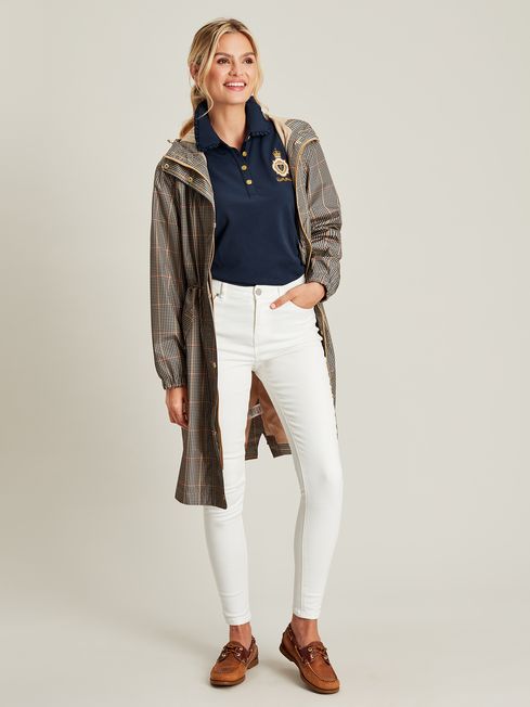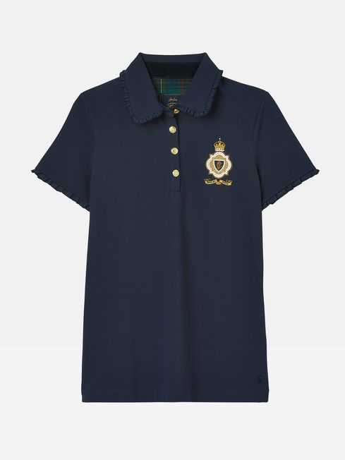 We've gone back to our countryside roots with this equestrian-inspired polo. The slim fit which hugs the body and the woven frilled trim to the collar and cuffs offer a feminine twist on the traditional polo. Its quality can be seen through the 'Joules Polo' badge to the chest, the faux horn button placket, contrasting checked back neck and plush velvet collar stand. Cotton blend Slim fit Short sleeves Woven frill trim to the collar and cuffs Velvet button placket and collar stand Checked inside back neck Embroidered 'Joules Polo' badge to the chest Joules hare embroidery to the hem