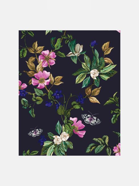 Dress your walls with the richness of the woodland. This floral pattern captures delicate springtime florals blossoming and growing within this botanical wallpaper design. The handpainted florals and foliage have depth and drama, and showcase exquisite detail. A dramatic colour palette brings this design to life with rich colour pops of pink, blue and green beautifully showcased on a French navy background. Printed on a matt substrate for a contemporary look and feel. This wallpaper is also pastethewall, making it easy to hang.