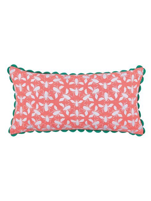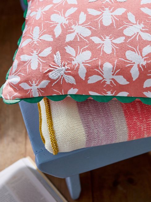 Inspired by everyone's favourite garden guests, this bee-printed cushion is the perfect way to show off your love for nature. It's buzzing with a mixture of printed and tufted bees in créme against an oh-so-summery coral background. The edges are finished with a delicate scalloped trim in a contrasting mint green. Layer it over the Permaculture Border bedding set to create a complete look or as an accessory for the living room.