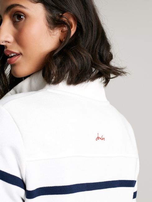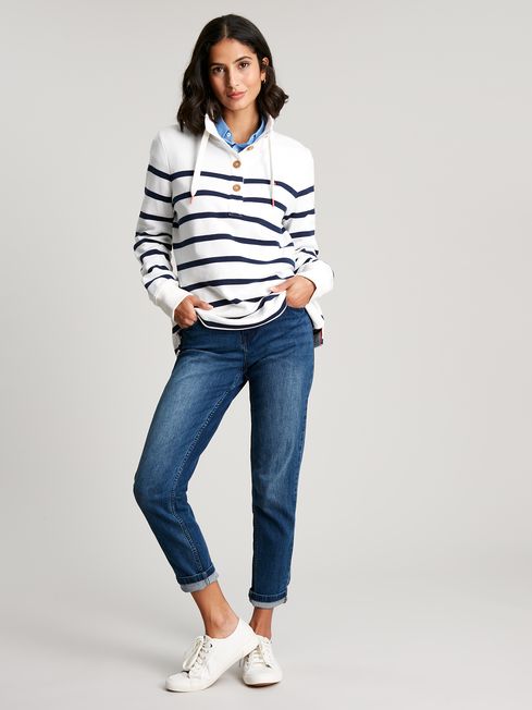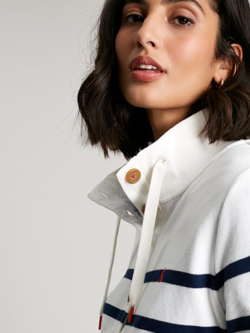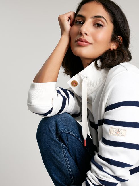As the name suggests, this sweatshirt is inspired by the coast and is perfect for those seaside strolls. It's crafted from a hardwearing jersey and has a funnel neck and button placket. The drawcord ties have been dipped in a contrasting colour that matches the small embroidered hare to the chest! There are side splits for freer movement, ribbed hem and cuffs and stripes to elevate your everyday look.