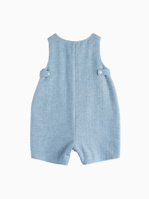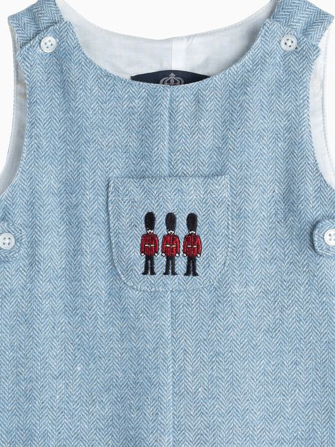This gorgeous romper for baby boys is made in a soft cotton mix and is the perfect winter outfit. Made in a pale blue herringbone with classic guardsman embroidery detailing, it features pearlised button fastenings and handy popper leg fastenings for easy dressing and changing.