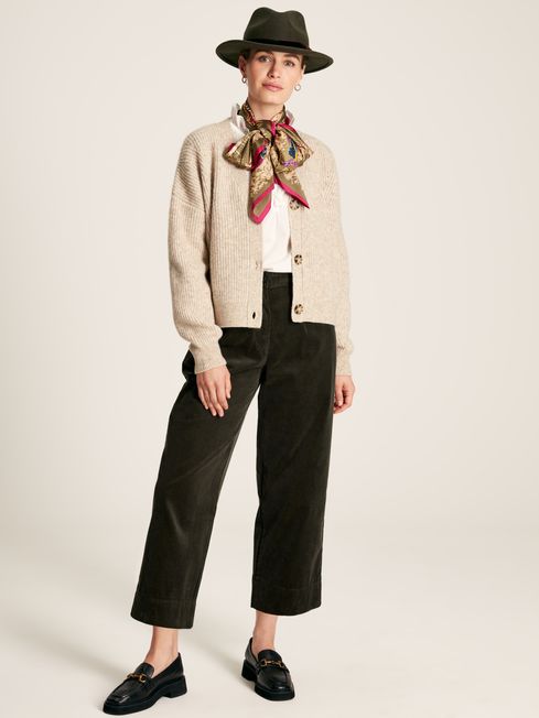 Crafted from a sumptuously soft wool blend, the Samantha cardigan is a layer you can rely on. Its relaxed, boxy fit makes is perfect for layering (we're thinking over a statement printed dress) and adding a comfortable feel to your everyday wardrobe. It has faux-horn buttons, ribbed hem and cuffs and dropped shoulders. The neutral colour ensures it will always remain a well-worn piece. Wool blend Ribbed knit Boxy, relaxed fit Long sleeves with dropped shoulders V-neck Faux horn buttons Ribbed hem and cuffs