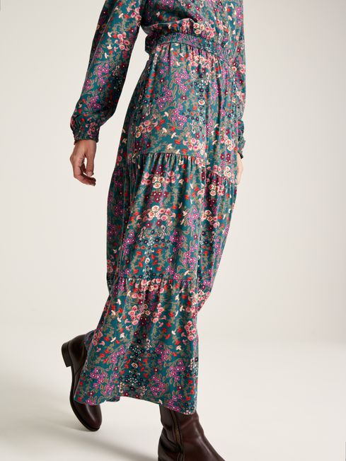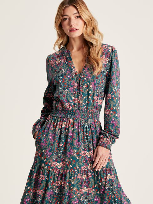 Our elegant and enchanting new Elsa dress is inspired by vintage styles, with darling details that are sure to turn heads wherever you choose to wear it. Adorned with a classic hand-drawn print, it features an eye-catching frill detail around the collar and down the centre front, ending at a cinched waist with shirred panelling. The set-in sleeves are gathered to create a voluminous effect, and have also been finished with shirred and frilled cuffs. The maxi-length skirt has three gathered tiers, and we have added a pocket to each side with pop colour stitching. LENZING™ ECOVERO™ fibers are derived from sustainable wood and pulp, coming from certified and controlled sources following the stringent guidelines of the Lenzing Wood and Pulp Policy. Frill detail to collar and chest Shirred cuffs and waist Set-in sleeves Tiered skirt Maxi length Pockets in side seams Hand-drawn print