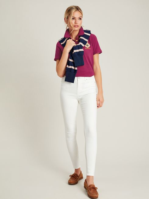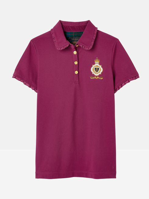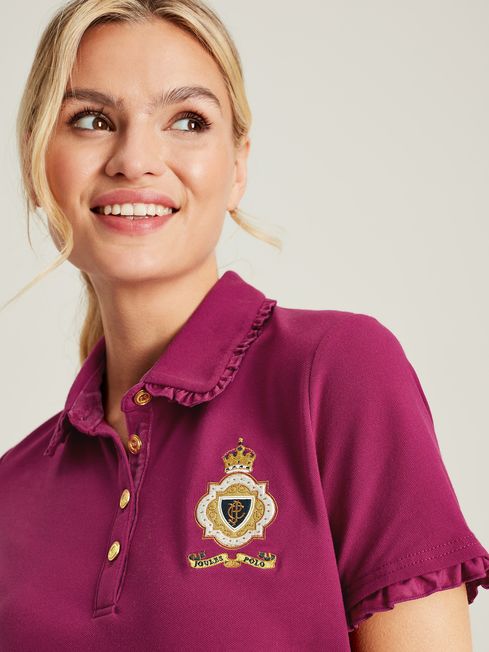 We've gone back to our countryside roots with this equestrian-inspired polo. The slim fit which hugs the body and the woven frilled trim to the collar and cuffs offer a feminine twist on the traditional polo. Its quality can be seen through the 'Joules Polo' badge to the chest, the faux horn button placket, contrasting checked back neck and plush velvet collar stand. Cotton blend Slim fit Short sleeves Woven frill trim to the collar and cuffs Velvet button placket and collar stand Checked inside back neck Embroidered 'Joules Polo' badge to the chest Joules hare embroidery to the hem