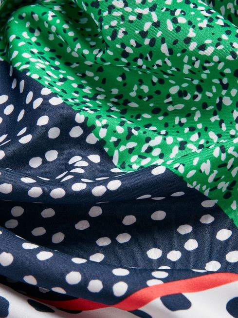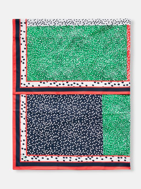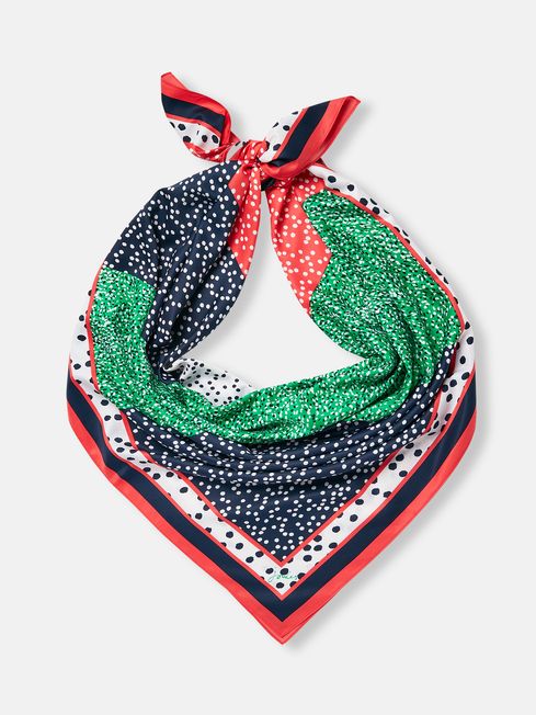 Add colour to any look with this printed twill scarf. The lightweight fabric and square shape are the perfect combination for versatile styling. Try wearing it as a neckerchief, or head scarf or incorporated into a ponytail or bun. It's adorned in a spot print and is finished with rolled edges. Twill scarf Lightweight Square Rolled edges 130 x 130cm Spot print
