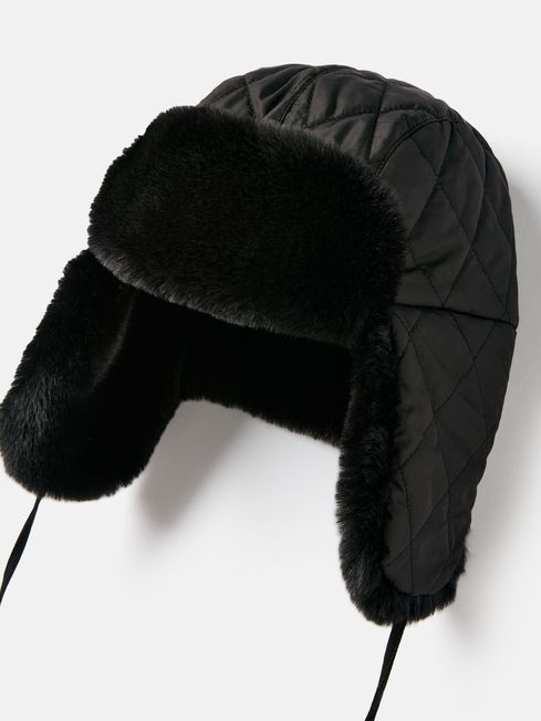 When the British winter delivers frosty mornings and (hopefully) snow, you'll be glad for the Eira hat. It has a traditional trapper design with ear flaps and hanging ties with metal stoppers. The outer features a diamond quilt while the inside has a full faux fur lining for supreme warmth. Stylish yet oh-so-practical. Faux fur Diamond quilted outer Faux fur lining and cuff Ear flaps with faux fur lining Ribbon ties with metal stoppers Joules branded tab to the back