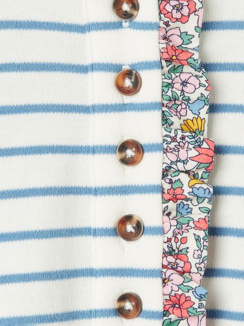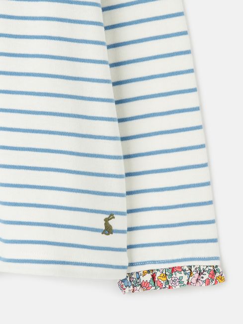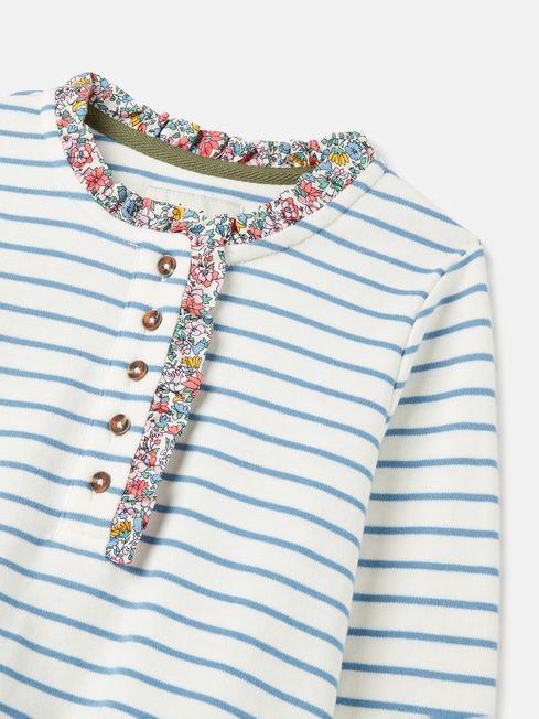 Your little one will love shimmering and shining bright in the Felicity top. It's adorned in metallic horizontal stripes which gleam against the navy background. Their second favourite part about this top is sure to be the pretty frilled detailing to the placket and cuffs. And because practicality matters too, it's got a classic fit through the body, long sleeves (easy for layering), a button placket and is crafted from soft jersey. It's finished with Joules branded embroidery to the hem and outer back neck. Jersey Classic fit Long sleeves Button placket with frilled trim Faux horn buttons Frilled cuffs Metallic stripes Joules branded embroidery to the hem and outer back neck