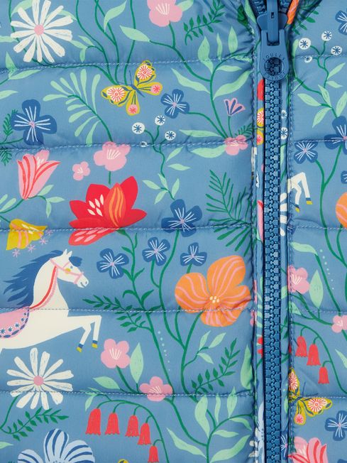 The reversible function of the Hayden gilet offers two styles in one. Practical for you, and fun for your little one. The prominent side (which we have an inkling will be their favourite) features a hand-drawn print that shows Pony's prance amongst colourful blooms. The other is a plain block colour finished with a Joules screen print hare to the chest. Both sides are padded and quilted and use a showerproof fabric that is perfect for light bursts of rain. There's a full zip fastening with a chin guard and the printed side has handy side pockets. It's a great layer for everything from the trip to school to exploring the great outdoors. Reversible style Showerproof Padded One printed, one solid colour side Funnel neck with chin guard Zip fastening Welt pockets (on the printed side only) Joules screen print hare to the chest